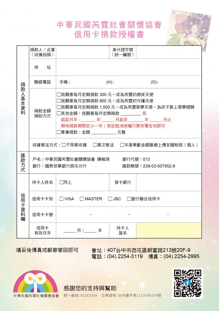 ❤傳真刷卡:請下載信用卡授權書,填寫完成後傳真給本協會即可.04-2254-2995
